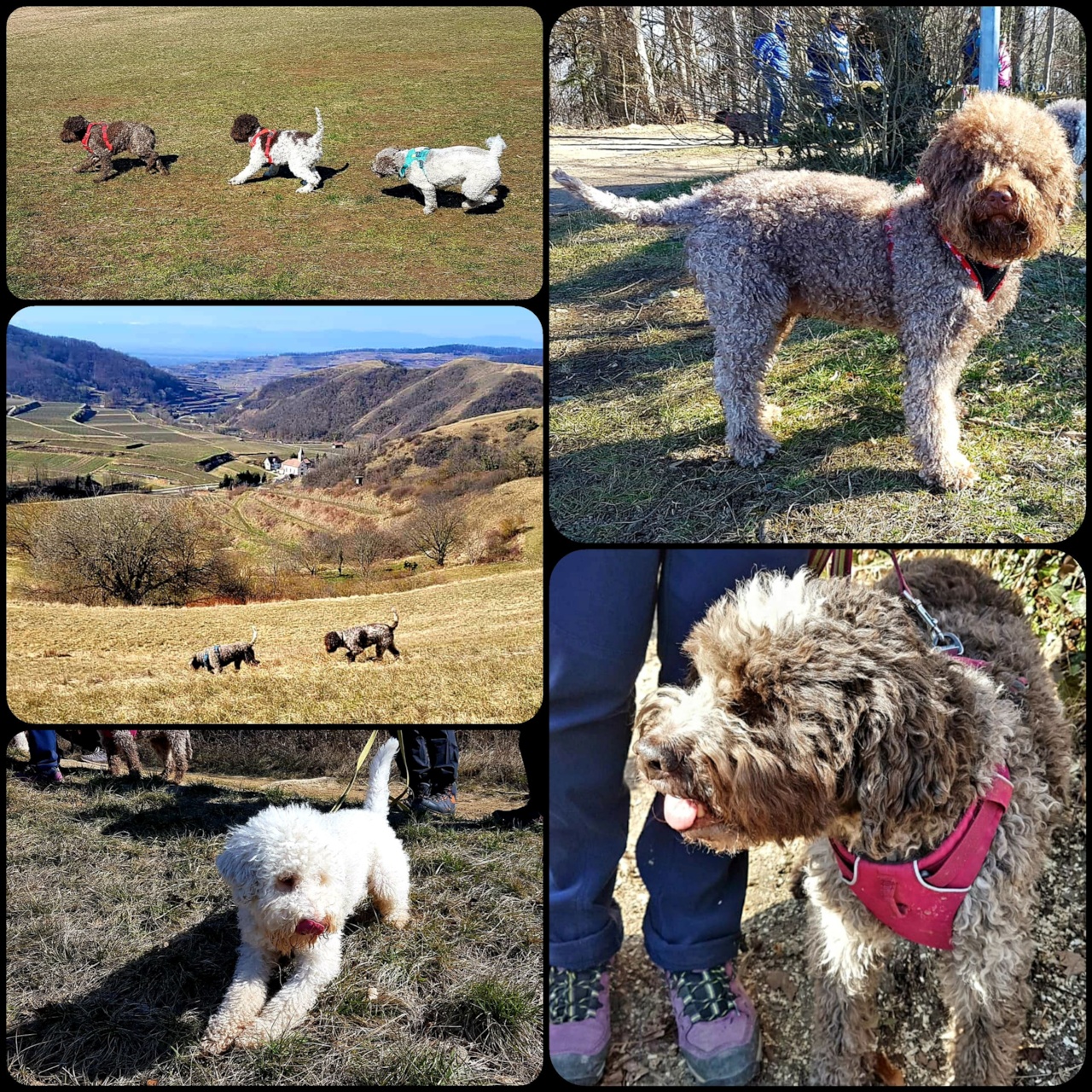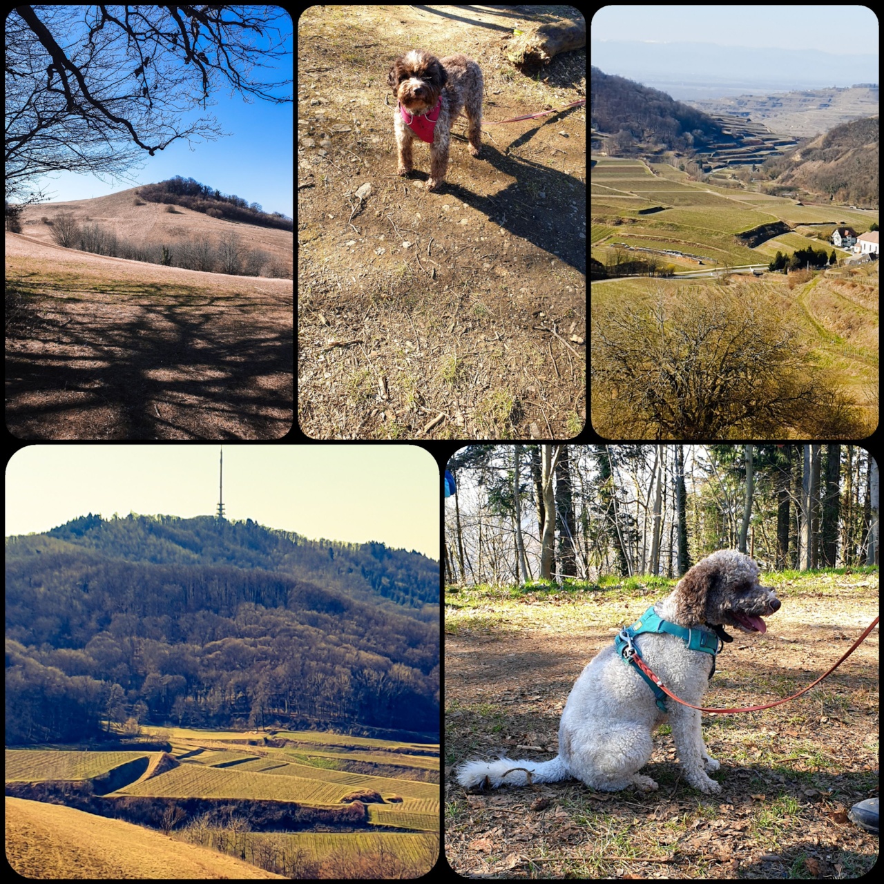 Und das mit 17 Hunden, davon 14 Rüden und 2 Hündinnen und der kleinen Flora (eine junge Pudeldame). Hundezüchter und Freunde/Halter der Rasse entspannt in vielen Gesprächen und regen Erfahrungs Austausch auch für die jenen, die diesen Monat ihren Welpen bekommen. Ein Teil kehrte danach ins Abseits ein (die Gaststätte heist so) wo wir bei einem Glaß Wein und leckeren Tapas den Tag schön ausklingen lassen. Bei herrlichstem Sonnenschein, aber doch eisiger Luft folgten wir ungefähr dem Geopfad, hinauf zum Eichelspitzturm, leider wars zu diesig für Alpensicht, mit schöner Sicht am Haselschacher Buck entlang, durch den Wald zum Rüttefelsen und zuletzt durch die Weinberge zurück.
