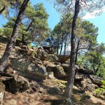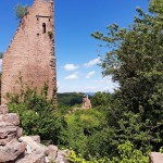 Wenig später erreichen wir die Hangkante mit den Trois Châteaux d’Eguisheim , den „Drei Exen“. An der ersten der drei aneinander gereihten Burgruinen, der Burgruine Weckmund, beeindrucken die massigen Türme. Die mittlere Burg, die Wahlenbourg, ist die älteste und wurde im 12. Jh. errichtet, während Weckmund und die dritte Burg, die Dagsbourg, aus dem 13. Jh. stammen. In den Burgen lebten verschiedene Familienzweige derer von Eguisheim.